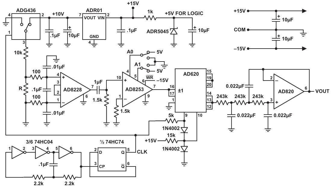 The AD8253 is configured in transparent gain mode, allowing the gain to be manually set by the user according to Table 1