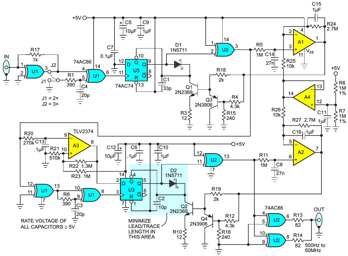 A 50 MHz 50:50-square wave output frequency doubler/quadrupler