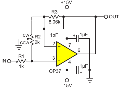 Figure 1. Low noise DC to 20 kHz audio gain stage based on the OP37 with pseudo-logarithmic gain adjustment