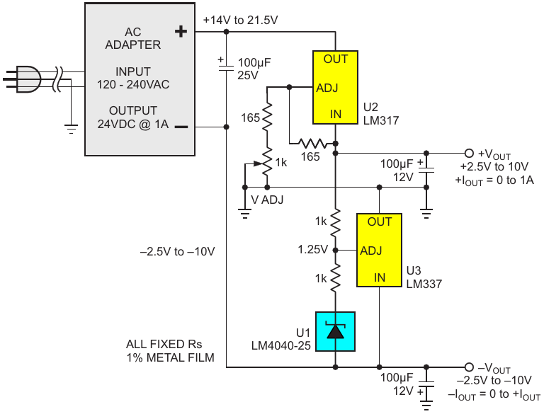 Figure 1. Symmetrical-output variable power supply uses single DC source with classic 3-leg regulators, one regulator (U3) operates in shunt mode as "rail-splitter"