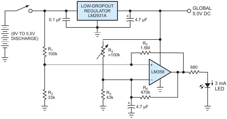 Depending on the 9 V battery's state of charge, the LED is either continuously on, off, or blinking at one of three rates & duty-cycles