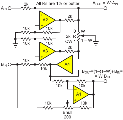 Figure 1. Op-amp solution requires four amplifiers comprising two Howland current pumps, a differential amplifier, and a boatload of precision resistors; it is also DC coupled