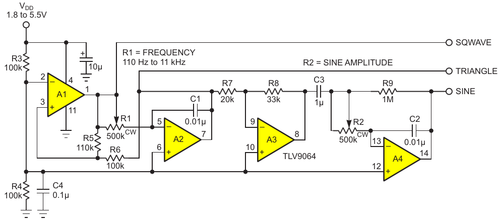 Figure 1. Quad highspeed RRIO TLV9064 op-amp performs as comparator, integrator, and clipper while sipping single-digit milliwatts from a single, flexible, power source