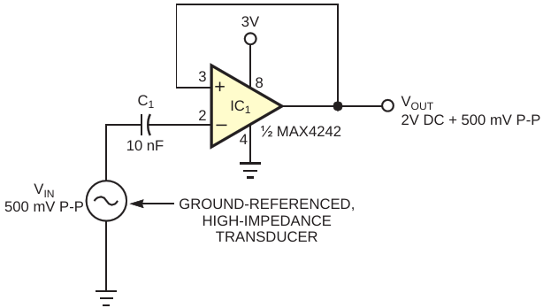 A self-biasing amplifier buffers a high-impedance signal without the need for bias resistors