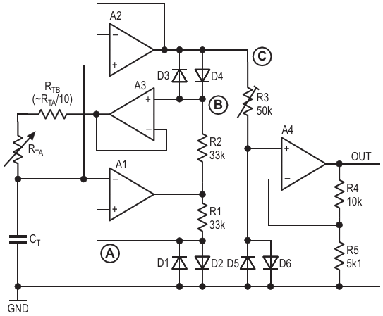 Figure 2. Simple, novel tri-wave generator and sine converter