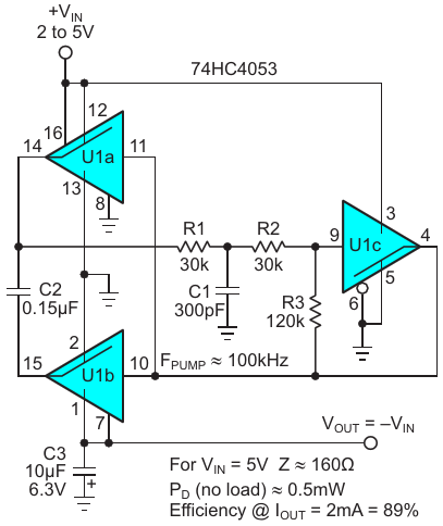Figure 1. The generic and versatile xx4053 provides the basis for a cheap, efficient, and accurate voltage inverter