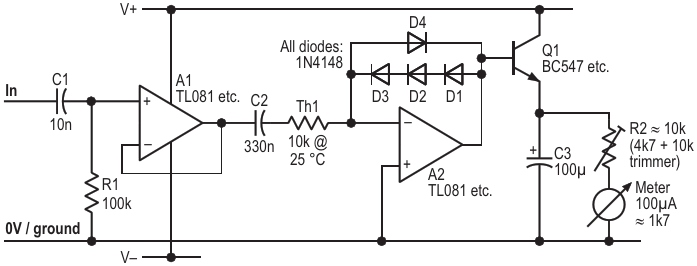 Figure 1. This basic peak log detector shows the principals involved and helps to highlight the problems. (Assume split, non-critical supply rails.)