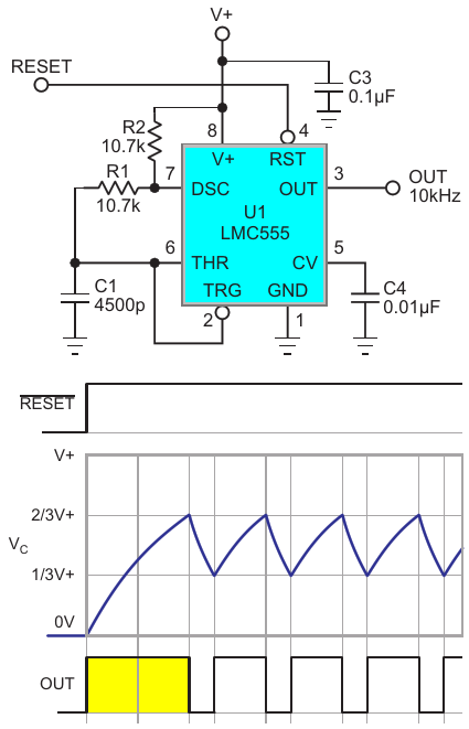 The problem - the first oscillation cycle has a too-long first pulse on start-up, when gated by the RESET pin from oscillation-off to oscillation-on