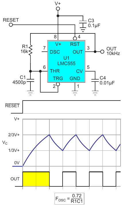 Figure 1. The problem - the first oscillation cycle has a too-long first pulse on start-up, when gated by the RESET pin from oscillation-off to oscillation-on