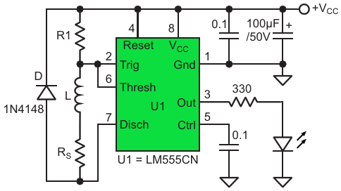 An astable 555 timer circuit based on an inductor, diode, and resistor