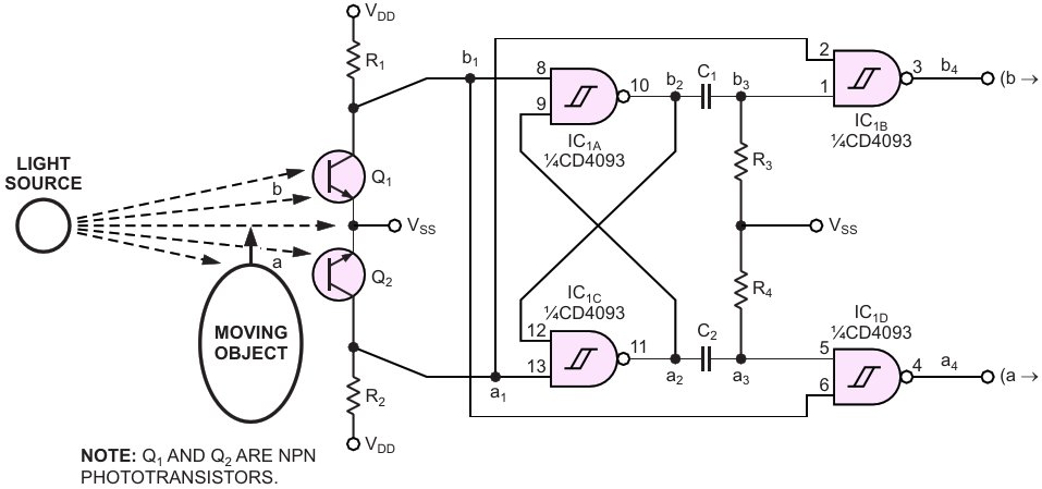Each output pulse from this circuit represents the direction of an object's movement past the two phototransistors, Q