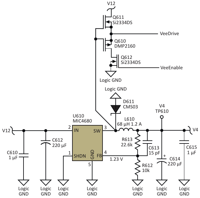 Figure 1. The 12-V downswitcher, which is already in the design, provides a square-wave to generate VeeDrive from V12 with about a 10-V swing