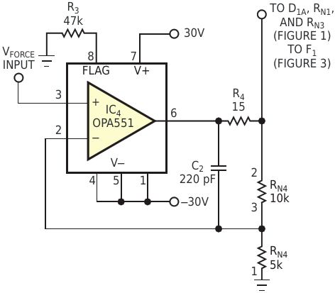 Figure 2. A gain-of-three high-voltage amplifier derives forcing voltages as high as ±22 V from voltages of ±7 V from test equipment