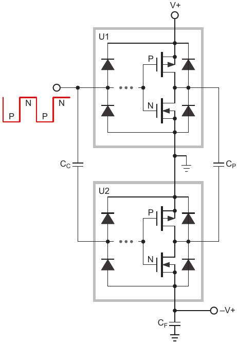 Figure 2. Simplified topology of logic gates comprising voltage inverter, showing driver device (U1), switch device (U2), and coupling (C