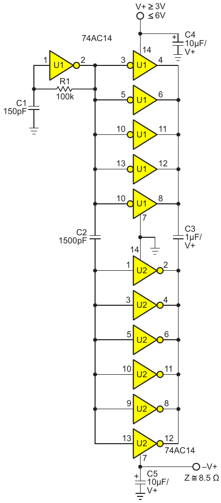 Complete voltage inverter: 100 kHz pump clock (set by R1C1), Schmidt trigger and driver (U1), and commutator (U2)