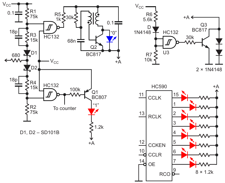 The logic probe with two Schmitt triggers where the upper determines logical 0 and the lower determines logical 1