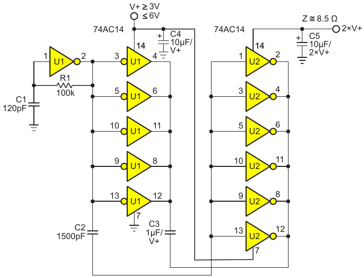 Complete voltage doubler: 100 kHz pump clock set by R1C1, Schmidt trigger, driver (U1), and commutator (U2)