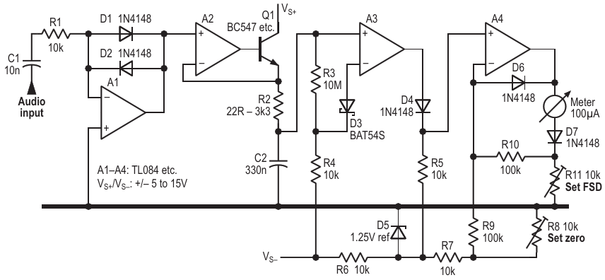 Figure 1. We take the log of the input signal; its peak level is captured on C2, which is discharged slowly and linearly; and temperature- and level-corrections are applied in the current source which drives the meter