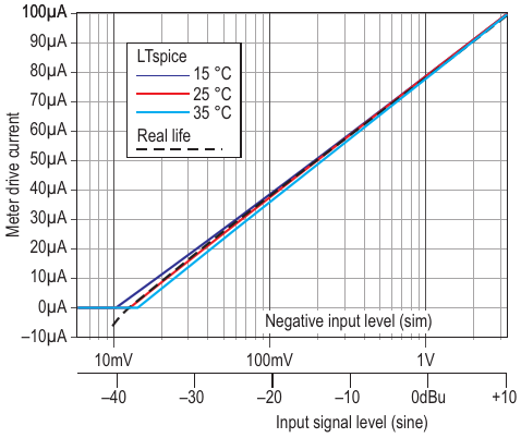 Simulated and measured responses when set up for a 50 dB span with a +10 dBu maximum reading, showing the effects of temperature and op-amp offset