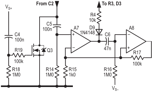 Figure 5. Final additions: a "power-on reset", and a monostable to give ~100 ms hold time after a peak to allow the meter movement to catch up