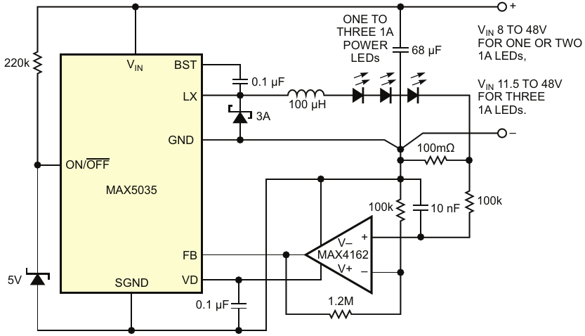 Figure 4. This miniature, 1 A, LED-driver circuit operates on 8 to 50 V and drives as many as three LEDs in series
