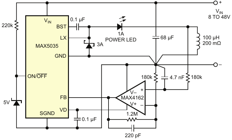 Figure 4. This miniature, 1 A, LED-driver circuit operates on 8 to 50 V and drives as many as three LEDs in series