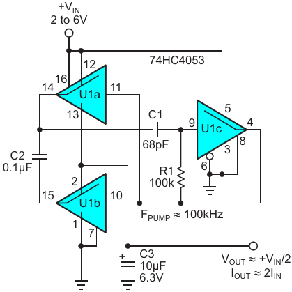 xx4053 based, 100 kHz, voltage-halving, current-doubling charge pump