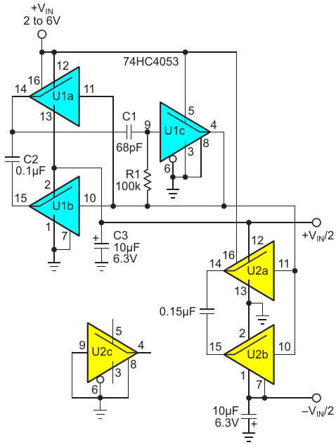 Figure 1. xx4053 based, 100 kHz, voltage-halving, current-doubling charge pump