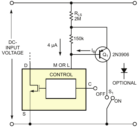 Figure 2. Instead of using just the external transistor to switch a TOPSwitch on or off, a simple on/off switch provides manual on/off control