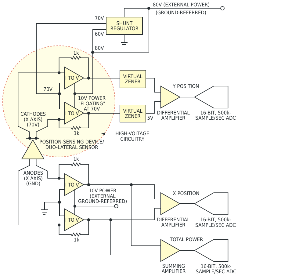 "Virtual-zener" circuits simplify the high-voltage interface in this position-sensing system