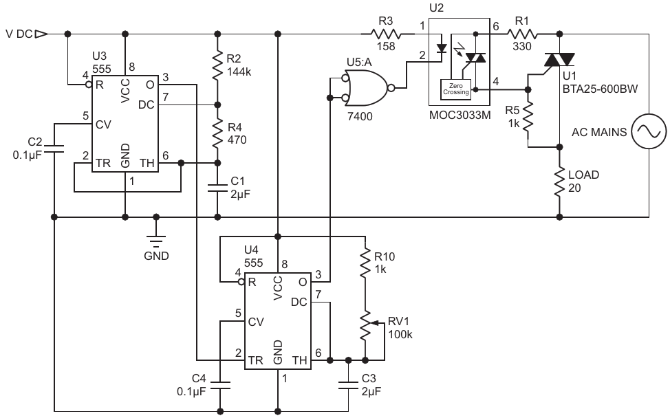 Circuit schematic of mains cycle skipping controller, this controller skips a certain number of power cycles in between, to vary power to the heaters