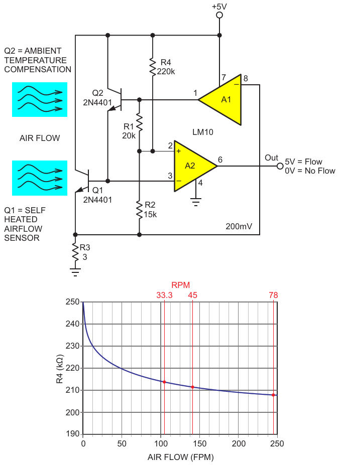 Figure 1. GO/NOGO thermal low speed airflow sensor, ON/OFF airspeed threshold is set by R4