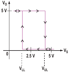Figure 2. The transfer characteristic of the Figure 1 circuit illustrates the hysteresis curve, and the lower and upper limits