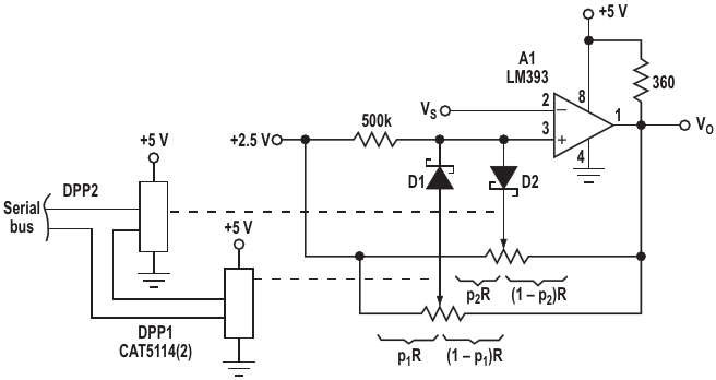 Figure 3. Adding steering diodes D1 and D2, plus another potentiometer, allows independent programming of the upper and lower hysteresis limits