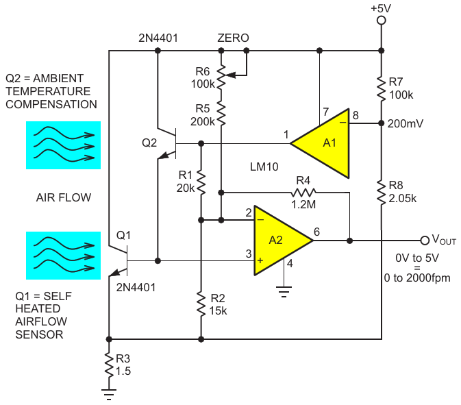 Figure 1. Typical self-heated transistor thermal airflow sensor