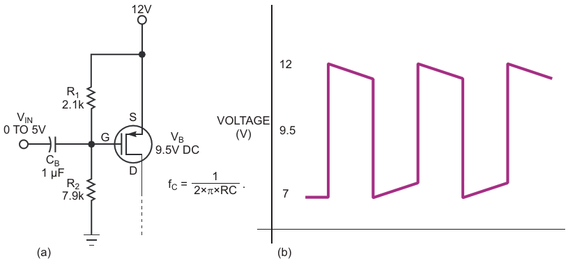 Adding resistive bias and capacitive coupling to an N-channel MOSFET (a) improves transition times but introduces waveform droop during on or off intervals (b)