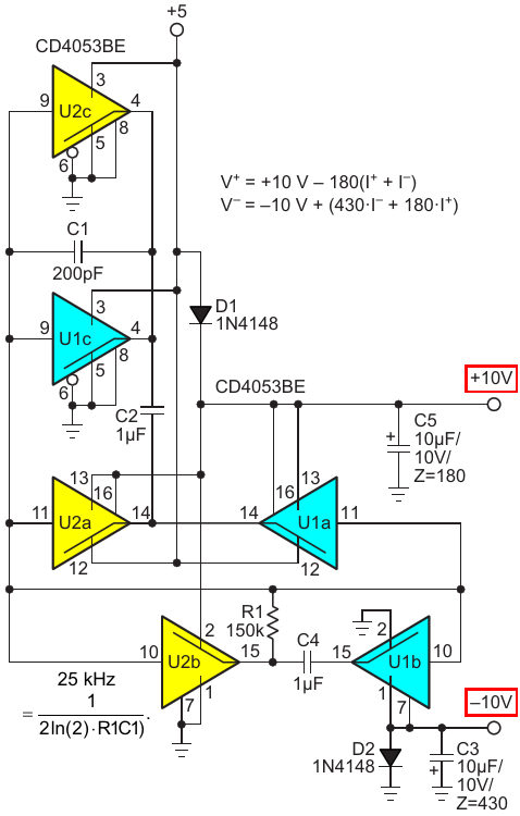 A 25 kHz multivibrator (U2b) clocks flying capacitor switches that first, double 5 V to +10 V (paralleled U1a,c and U2a,c), and then inverts it to -10 V (U1b and U2b)