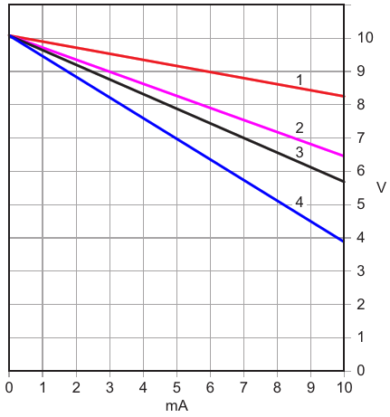 Output voltages under four loading scenarios: (1) +10 V output with +10 V loaded 0 to 10 mA, -10 V unloaded; (2) +10 V output with both +10 V and -10 V loaded 0 to 10 mA equally; (3) -10 V output with -10 V loaded 0 to 10 mA, +10 V unloaded; (4) -10 V out