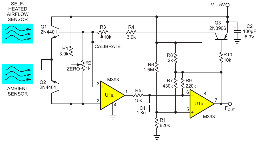 Figure 4. Figure 1's anemometer modified with U2, A1, and R11 - 14 to servo Q1 and Q2 bias currents to (mostly) null the effects of battery voltage droop