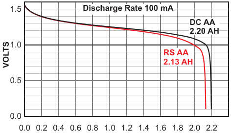 Figure 3. Typical AA cell discharge droop curves with an undesirable ±20% roll-off of battery voltage during discharge, resulting in a degradation of anemometer calibration accuracy