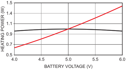 Nulled (black) and uncompensated (red) Q1 heating versus battery voltage droop (5 ±1 volts)