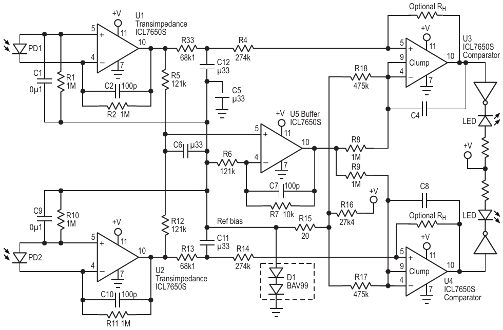 Figure 1. Since the optical levels need to be averaged to a DC value, the capacitors serve to remove data and test tone modulation from the detected optical signals. C2, C7, and C10 ensure op amp stability. C4 and C8 are optional to slow flicker when the comparator