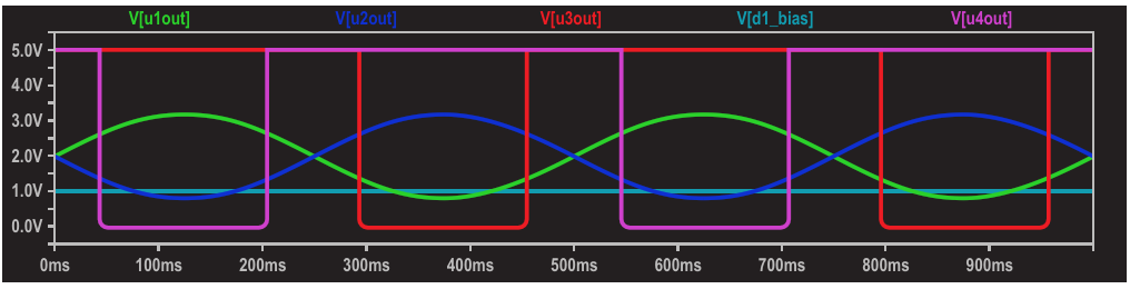 This simulation shows both photodiodes with a DC offset current of 0.5 µA (2 V on the left scale) and ±0.6 µA variation to demonstrate the comparator responses with the resistor values shown in Figure 1. Reducing the values of R8 and R9