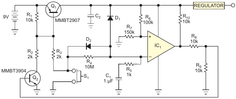 RC-timed shutoff function uses op amp and momentary switch