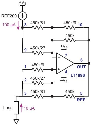 LT1996 used as a pin-strap-programmable current sink/ source, in this case, dividing the reference current by 10