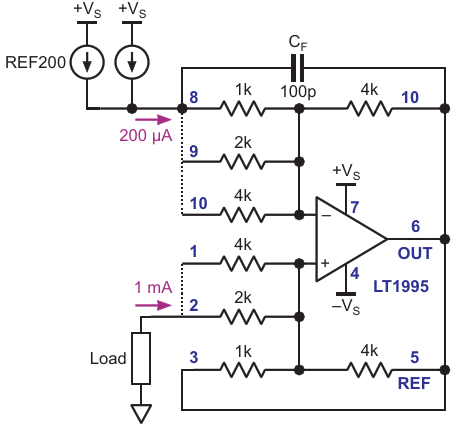 Figure 2. LT1996 used as a pin-strap-programmable current sink/ source, in this case, dividing the reference current by 10