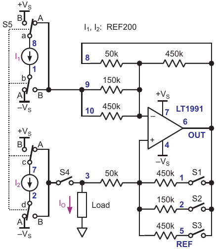 Figure 4. An LT1991 is used to source/sink from 10-90 µA in 10 µA steps