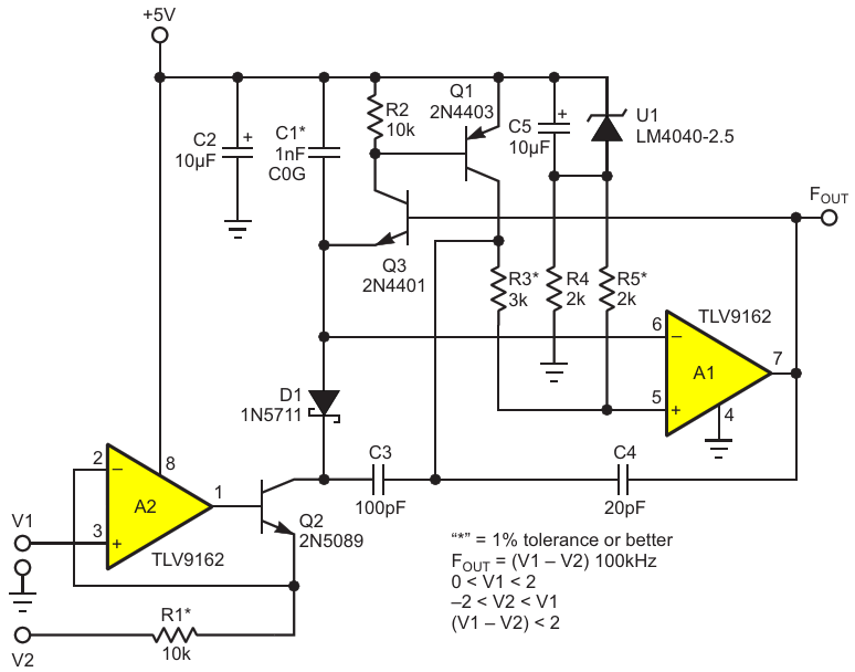 Figure 1. A Ramp-Comparator style 200 kHz VFC that operates from a single supply rail, with differential bipolar inputs, and an acceptable linearity