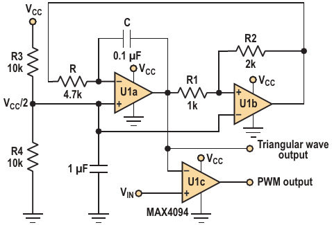 This three-op-amp circuit produces both a triangular wave and a variable-pulse-width output
