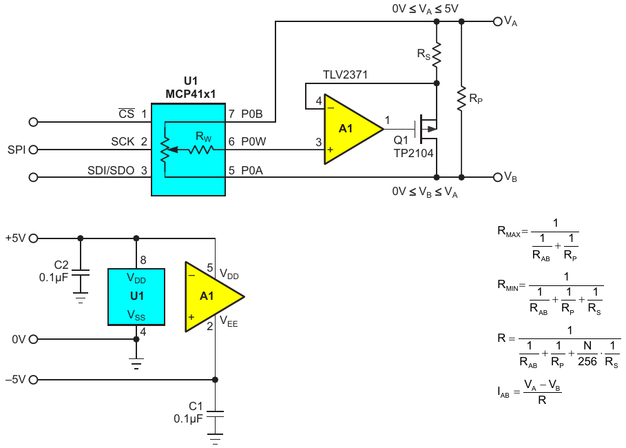 Figure 2. Synthetic Dpot evades problems using FET shunt, precision fixed resistors, and op-amp